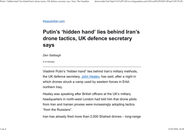 Larmee iranienne applique des tactiques transmises par larmee russe en particulier lusage des drones a basse altitude 12 mars 2026