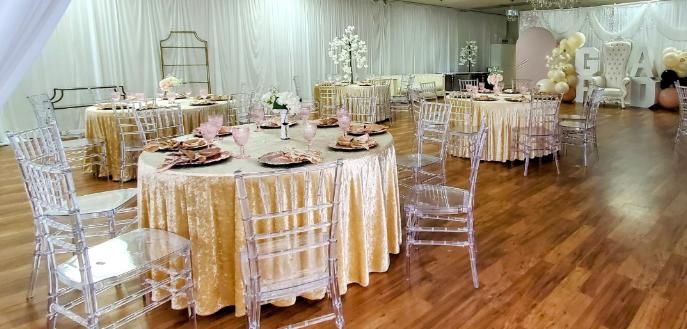 High-quality tables, chairs, linens, lighting, and décor elements are available to elevate any event setup.