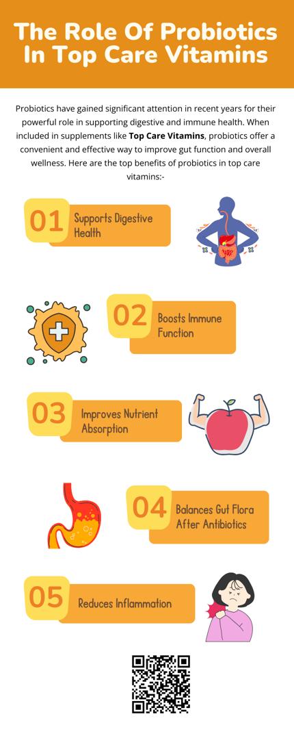 Probiotics are a valuable addition to Top Care Vitamins, enhancing the benefits of traditional nutrients by promoting a balanced gut microbiome. From better digestion and improved immunity to increased nutrient absorption and mental well-being, probiotics play a vital role in supporting long-term health. By incorporating probiotic-rich supplements into your daily routine, you’re investing in a stronger foundation for overall wellness.