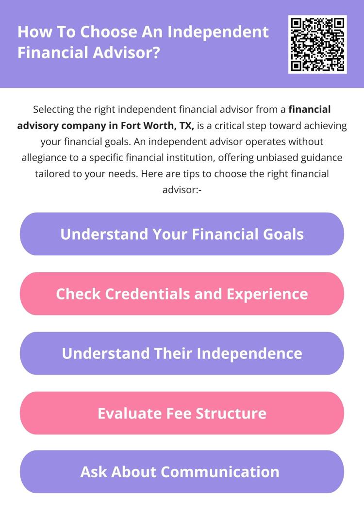 Choosing an independent financial advisor from a financial advisory company in Fort Worth, TX requires careful research, a clear understanding of your goals, and an evaluation of credentials, fees, and investment philosophy. An advisor who aligns with your objectives and communicates effectively can provide valuable guidance, helping you grow and protect your wealth. Taking the time to select the right professional ensures a strong foundation for long-term financial success.