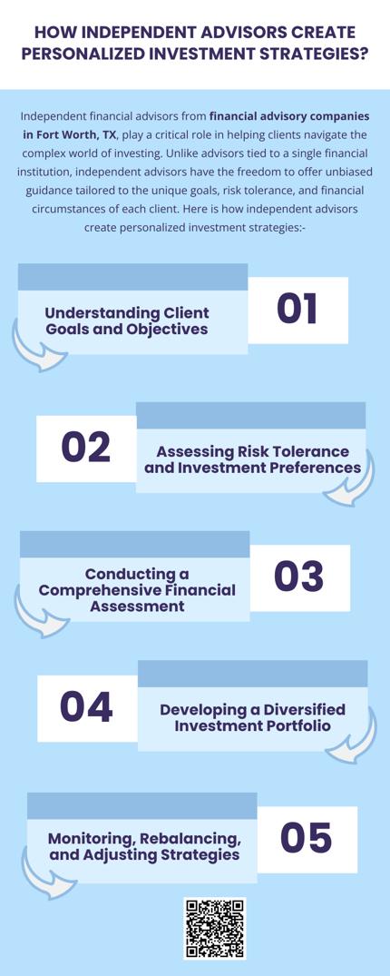 Independent advisors from financial advisory companies in Fort Worth, TX, create personalized investment strategies by combining in-depth financial analysis, client-focused planning, diversification, ongoing monitoring, and clear communication. Their independence allows them to recommend solutions that are truly aligned with each client’s unique goals, ensuring a strategy that is both customized and adaptable to changing circumstances.