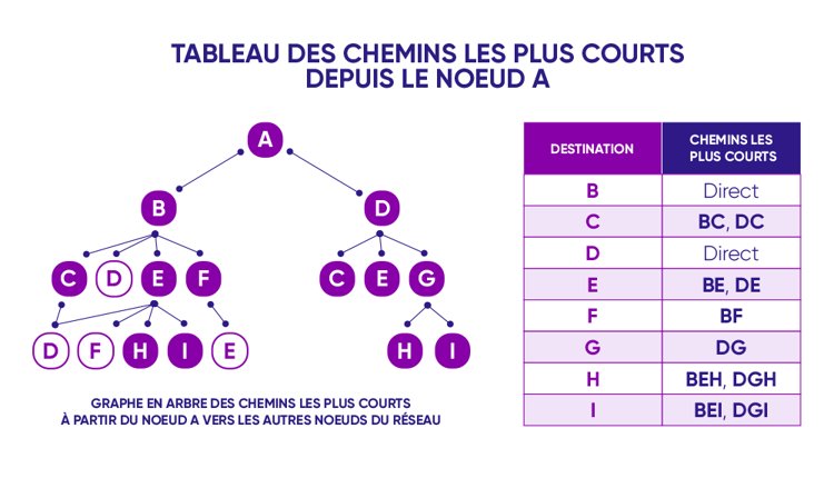 Il est possible de modéliser un réseau par un graphe en arbre à partir du routeur chargé d'acheminer l'information. Ce graphe permet de construire un tableau dans lequel figurent tous les chemins les plus courts, au sens de plus proches voisins, entre un nœud de départ et les autres nœuds qui composent le réseau.