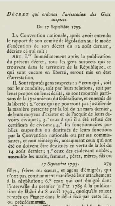 Promulguée dans le contexte de la Terreur elle vise à lutter contre les ennemis de la Révolution et à prévenir les complots contre-révolutionnaires. Elle définit les critères pour déclarer une personne suspecte et autorise l'arrestation et l'emprisonnement de ces individus sans procès ni jugement. C'est une loi d'exception, qui suspend le respect des principes démocratiques.
