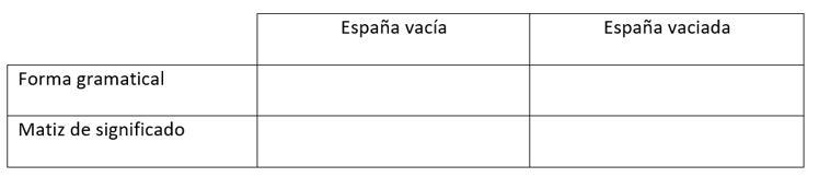 2. Rellenad juntos el cuadro siguiente para explicar la diferencia que hace el autor entre las locuciones España vacía y España vaciada. Precisad cuál prefiere el autor.