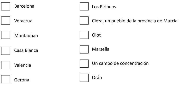 1939: Testimonios del exilio. Piedad Juana Semitiel1. Ordena los siguientes lugares citados por Piedad para reconstruir el recorrido de su exilio.